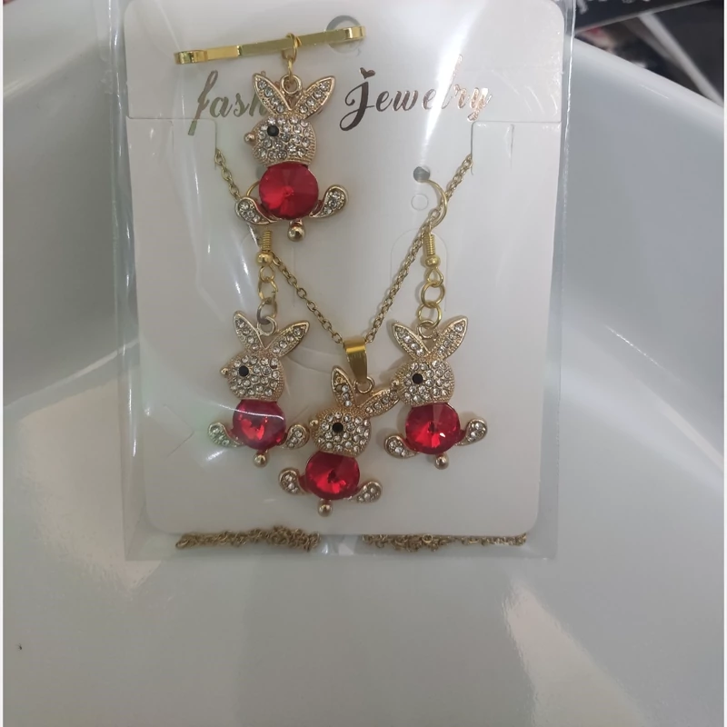 نیم ست طرح خرگوش قرمز با گیره روسری ست و دستبند مروارید